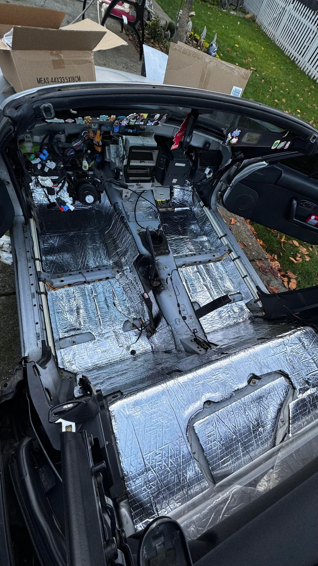 Before you even think about swapping speakers, treat the Miata’s metal shell like an empty drum and deaden it. Plan on a full weekend for first-timers. Pull the seats, door cards, rear parcel-shelf trim, and as much carpet as you can manage. Vacuum every nook, then wipe all exposed metal with isopropyl alcohol until the rag comes back clean, grime keeps butyl sheets from sticking. Cut 35–40 ft² of Dynamat, Silent Coat, or any reputable butyl mat into manageable patches; aim to cover about 70 percent of each large panel, because chasing 100 percent only adds weight without audible gain. Warm the sheets with a heat gun if the weather’s cool, press them into place, and roll them flat from the center outward to chase out air bubbles. Once the butyl is down, follow with a layer of 6 mm closed-cell foam on the broader surfaces and especially behind future speaker locations. Expect 10–12 man-hours if you’re meticulous, long, messy, but absolutely worth it.