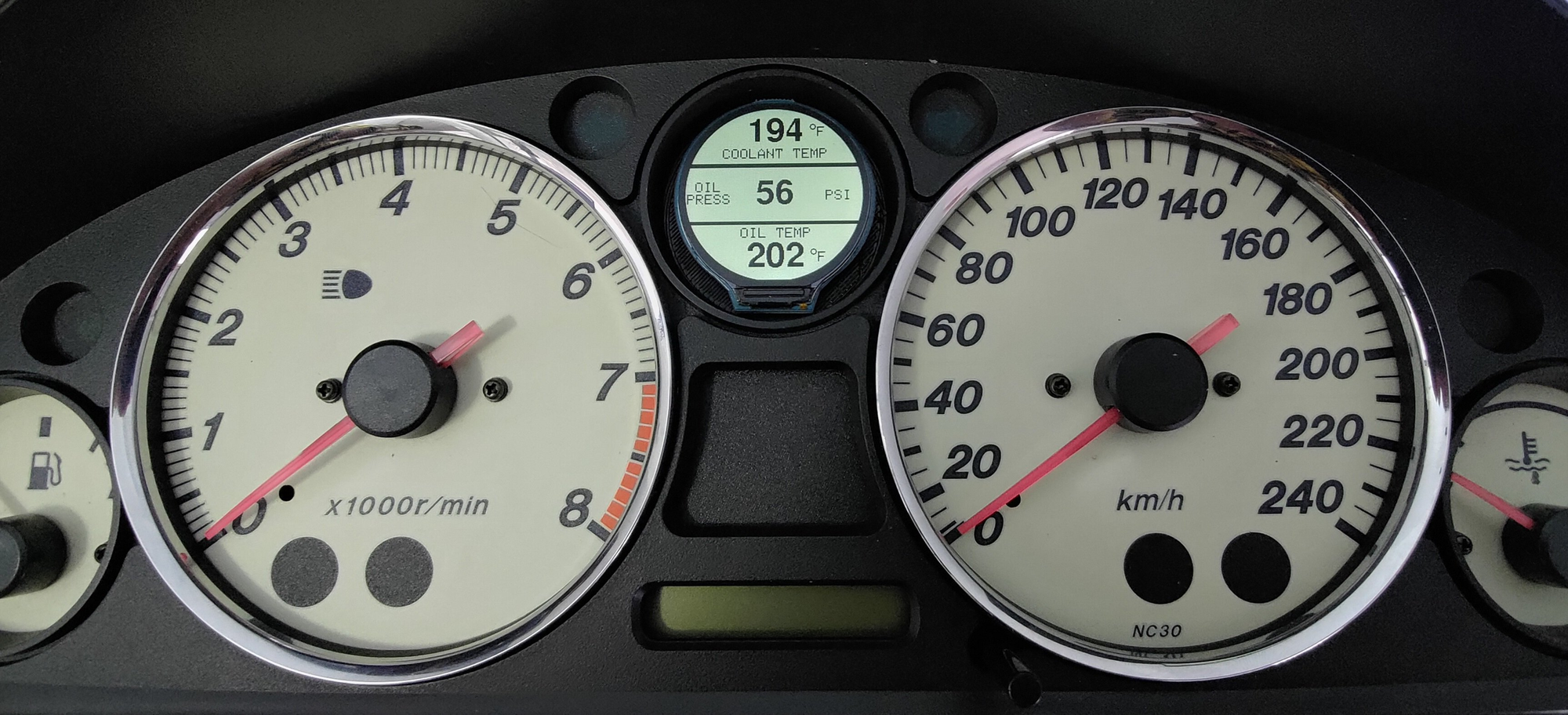 Miatas from the NA and NB generations use a temperature gauge that hangs at the 12 o’clock position across a wide temperature range, then shoots up quickly once the engine crosses a critical threshold. By the time you notice the gauge climbing, you could already be at the edge of trouble. Warning signs of overheating include the temperature needle creeping past center, a noticeable coolant smell or steam under the hood, coolant bubbling into the overflow tank or onto the ground, and reduced power or pinging (when the ECU retards timing to protect the engine). If you see any of these symptoms, pull over safely and let everything cool down before investigating further.