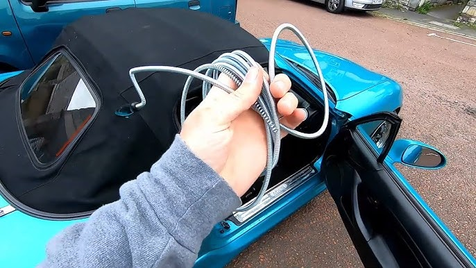 Put the top up, open both doors, slide the seats forward, and shine a light behind each seat-belt tower to find the drain funnels. Feed the brush or flex cable down from the top, never up from below or you’ll compact debris into the funnel. Ease it through until it pops out under the rocker, pull out the gunk, and follow with a small water flush. Pour a cup of water into each funnel and confirm a steady stream on the ground.