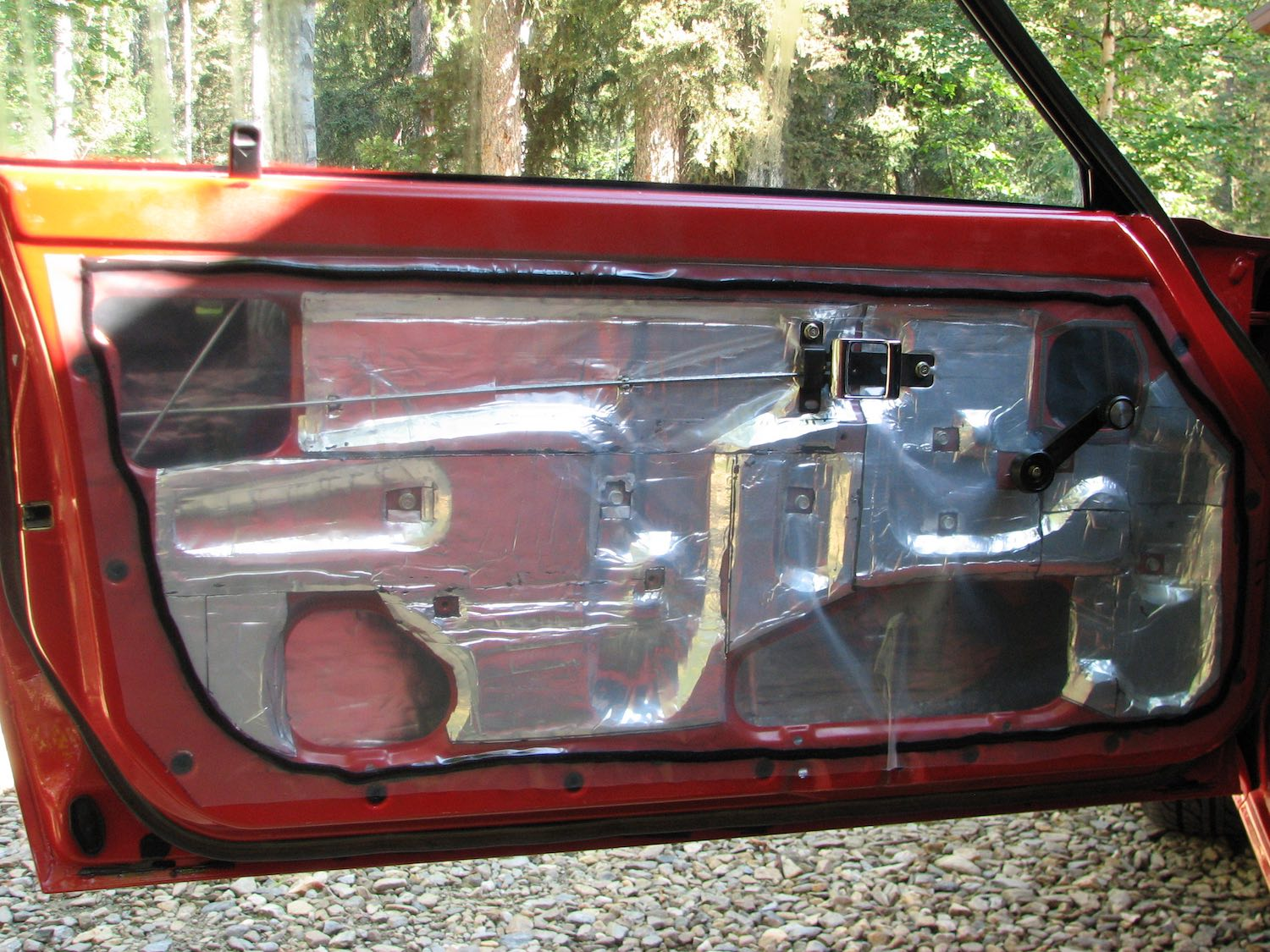 Water is supposed to pass the outer window sweep and drip inside the door shell. The only thing keeping it off your door card and carpet is the plastic vapor barrier stuck to the inner skin with butyl. If a corner lifted, water will ride the cable runs right into the cabin. Peel back the old plastic, roll fresh butyl all the way around every edge and opening, patch around speakers, and confirm the small drain holes along the bottom of the door are open.