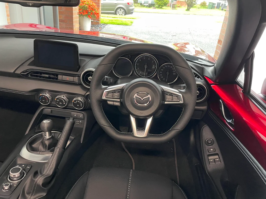 The stock Miata ND steering wheel is functional, but for those who want a more premium feel, the Guardian Design Steering Wheel offers a notable upgrade. This steering wheel is thicker, providing a better grip for spirited driving, which improves overall handling. Beyond the functionality, it features perforated leather sides with green accent stitching, adding a sophisticated touch to your car’s interior. The combination of enhanced grip and stylish detailing makes it a standout modification.