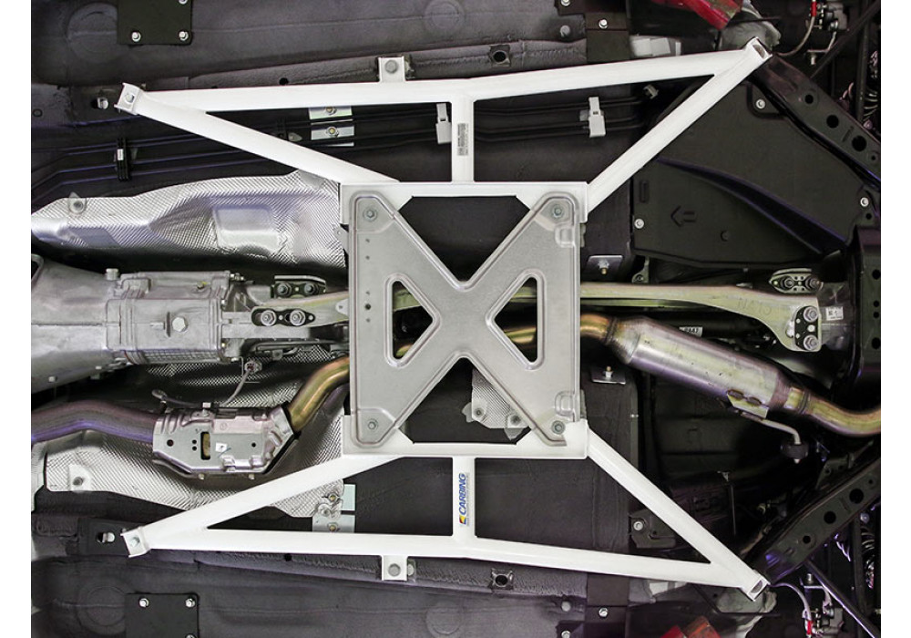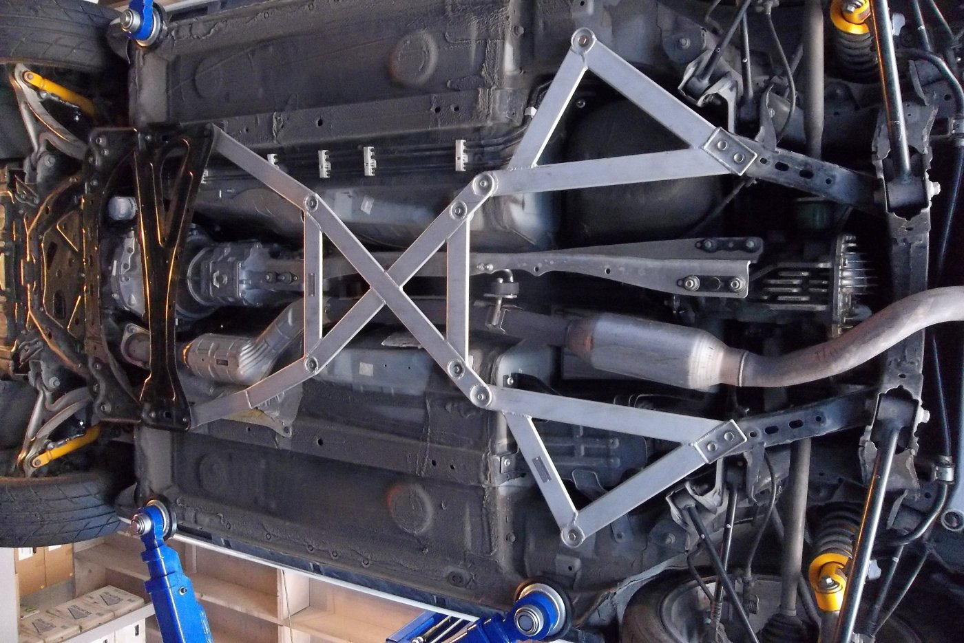 Under-floor X (“butterfly”). Once the rails are solid, cross-tie them to the tunnel so the floor acts like a box. Good systems sit no lower than stock bracing, keep weight low and central, clear common exhaust routes, and are designed to allow transmission and differential service without a full teardown. This is the “whole-car” feel upgrade most owners notice immediately.
