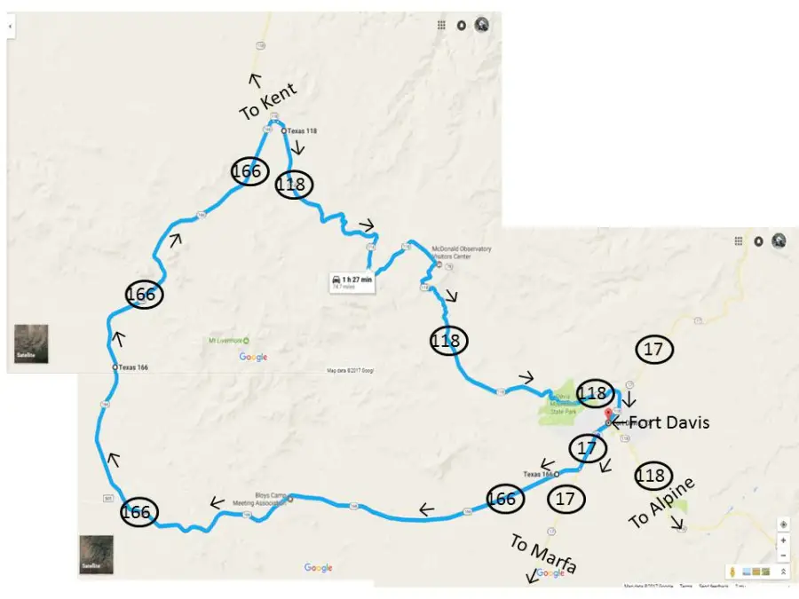 Route 3 , Davis Mountains Scenic Loop: Fort Davis → TX-166 → TX-118 → Fort Davis