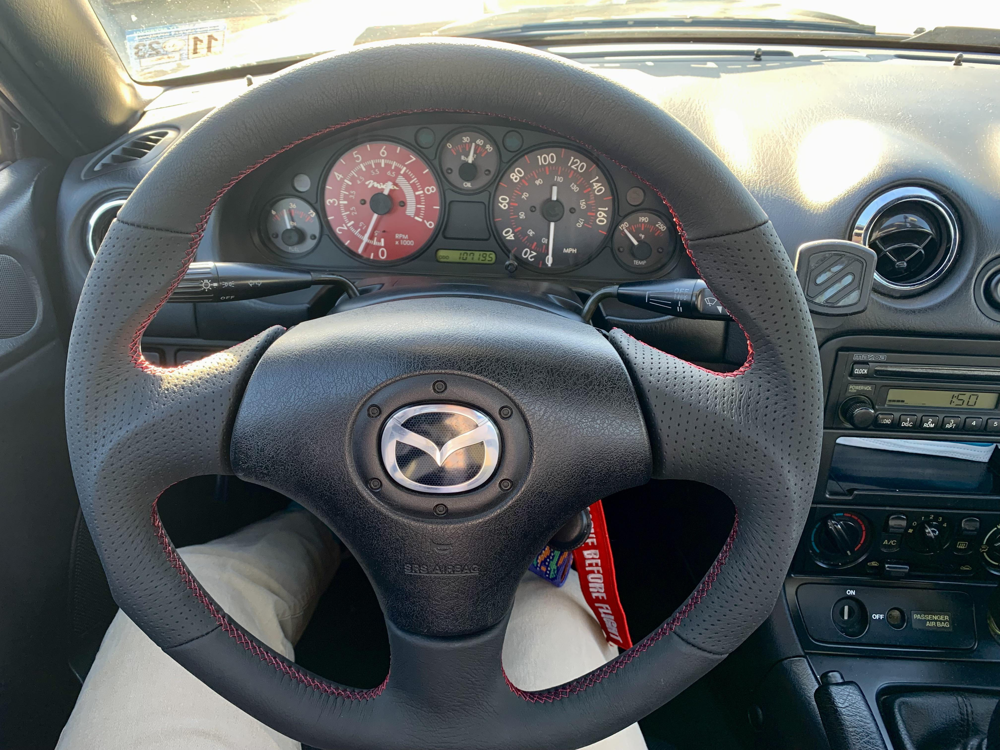 A common and straightforward upgrade is swapping the four-spoke steering wheel for the later NB Miata’s three-spoke version. This upgrade not only modernizes the interior’s appearance but also retains the car’s airbag, an important safety feature. For those who prefer a more OEM look while still refreshing the interior, this option is ideal.